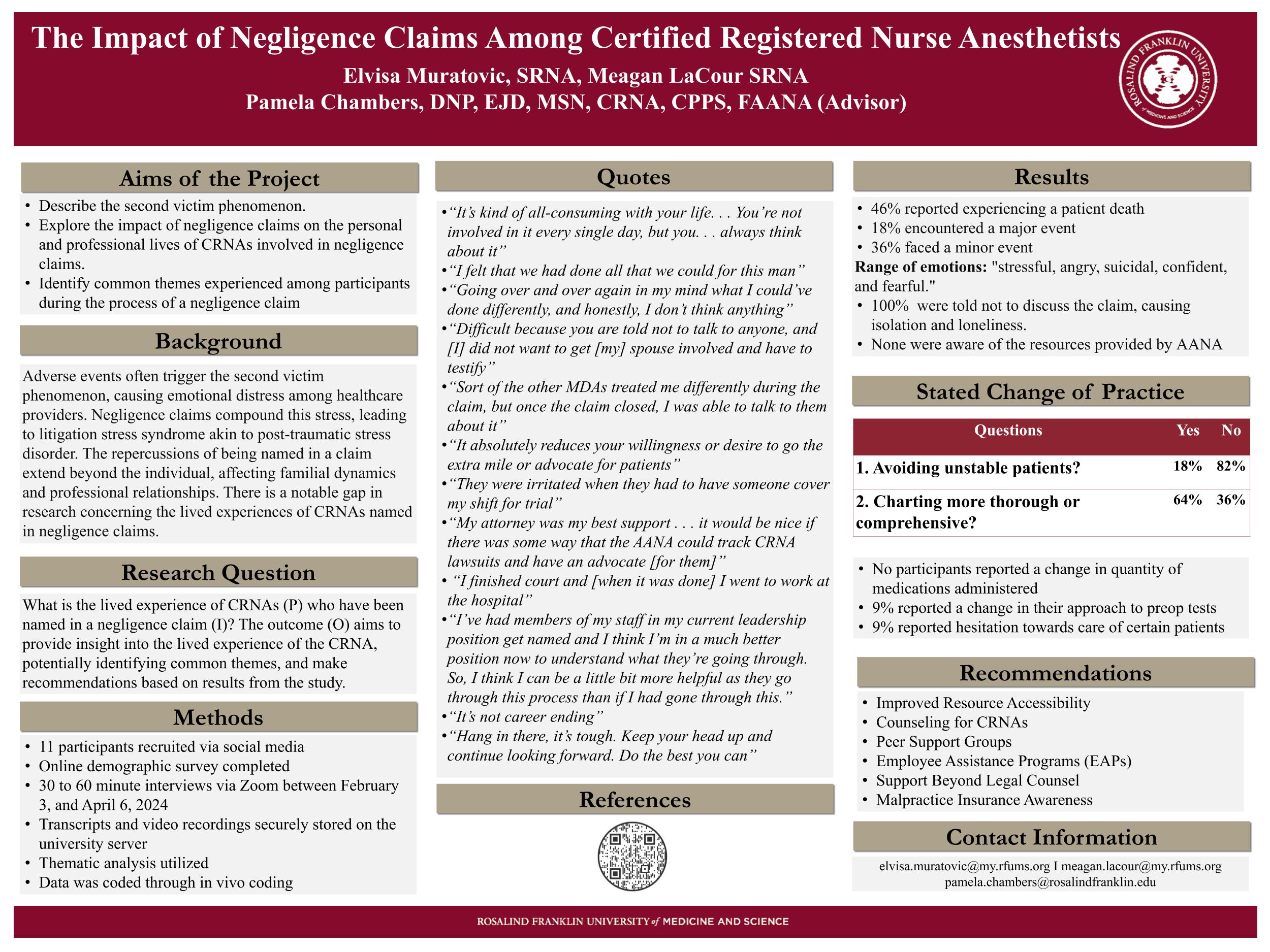 Conclusion: CRNAs involved in a negligence claim expressed significant feelings of isolation during their experience. The emotional toll of a negligence claim can affect individuals' mental health, leading to anxiety, depression, or anger that can affect their relationships with others.
