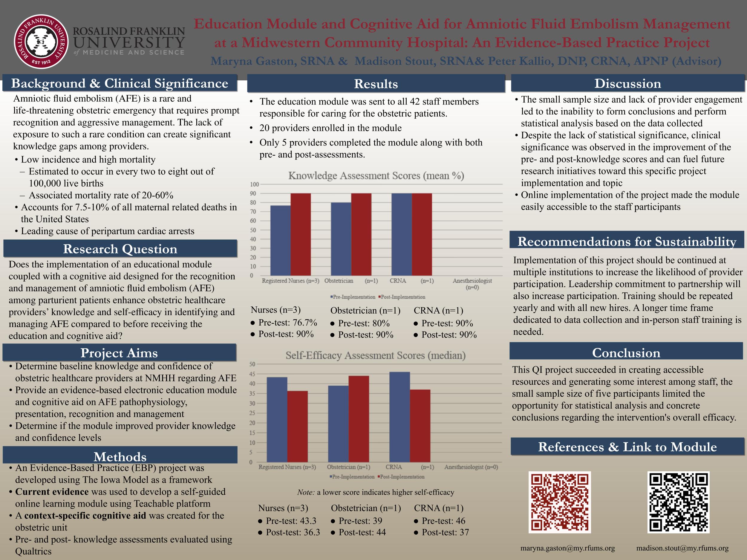 Methods: In an effort to fill knowledge gaps for obstetric providers, an evidence-based electronic education module coupled with a physical cognitive aid (CA) regarding the recognition and management of AFE was developed and disseminated to clinical staff between 4/29/24 and 7/1/24. A comparative single group pre/posttest study design was used to assess the primary outcomes of provider knowledge and self-efficacy levels before and after completing the module. The pre/post scores and data regarding participant roles were analyzed and compared.